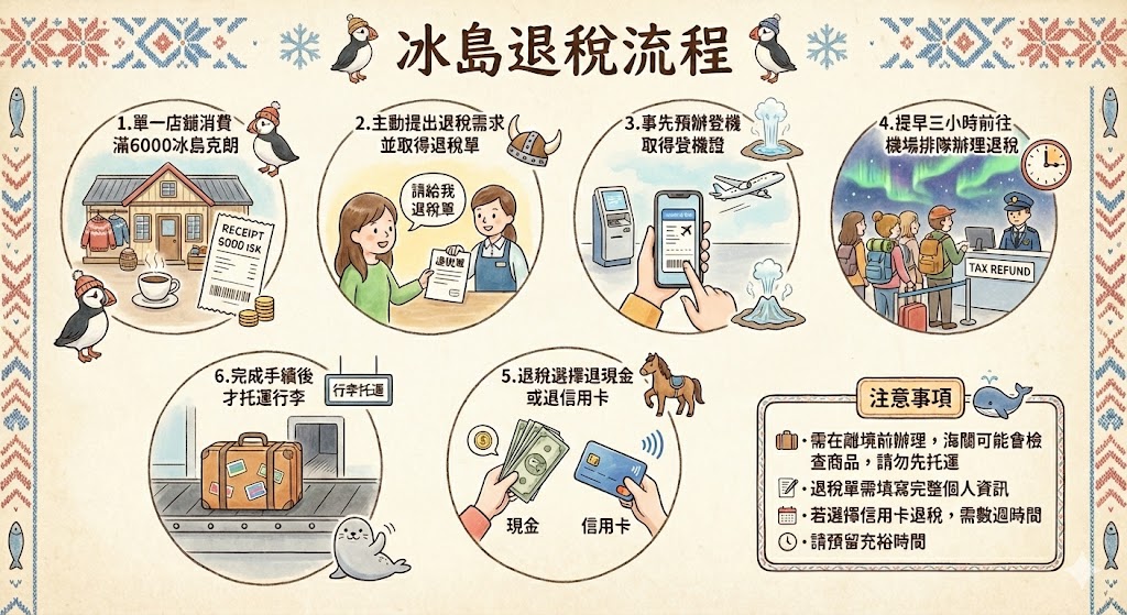 退稅:冰島並非歐盟成員,所以冰島消費在冰島離境時就必須辦理退稅(單商店滿6000冰島克朗),需要提早三小時以上到機場辦理(流程:先預辦登機取得登機證>排隊辦理退稅>選擇現金或信用卡>托運行李)