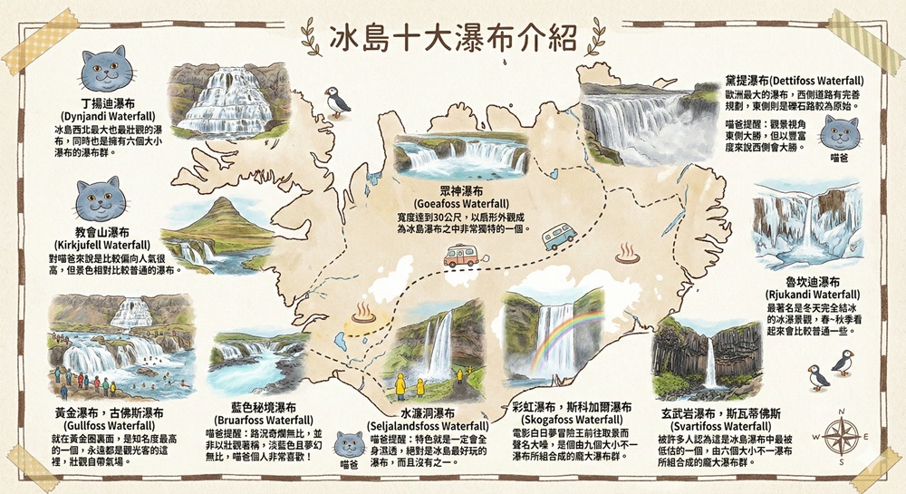 黃金瀑布古佛斯瀑布(Gullfoss Waterfall)、藍色秘境瀑布(Bruarfoss Waterfall)、水濂洞瀑布(Seljalandsfoss Waterfall)、彩虹瀑布斯科加爾瀑布(Skogafoss Waterfall)、玄武岩瀑布斯瓦蒂佛斯(Svartifoss Waterfall)、魯坎迪瀑布(Rjukandi Waterfall)、黛提瀑布(Dettifoss Waterfall)、眾神瀑布(Goeafoss Waterfall)、教會山瀑布(Kirkjufell Waterfall)、丁揚迪瀑布(Dynjandi Waterfall)