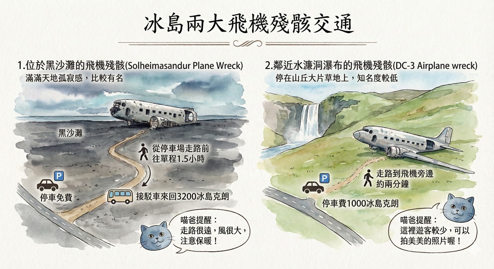 冰島共有兩個飛機殘骸,位於黑沙灘(Kirkjufjara Beach)上的飛機殘骸(Solheimasandur Plane Wreck)因為能把海景一起拍入、有滿滿的孤寂天地遼闊感而名氣較高;另一個飛機殘骸(DC-3 Airplane wreck)則是鄰近水濂洞瀑布(Seljalandsfoss Waterfall),則是知道的觀光客較少,選擇哪一個頗有個人喜好的意味。