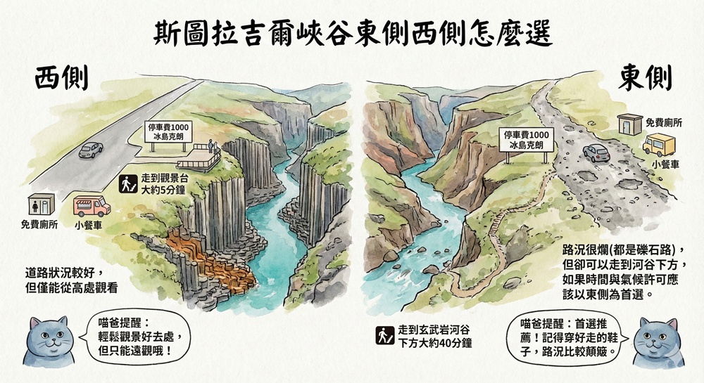 而東側步道可以直接下到河谷去觸碰玄武岩柱與冰涼湖水,體驗與觀景角度都好上百倍以上,所以這也是喵爸一直強調如果時間與氣候許可應該以東側為首選的主要原因。