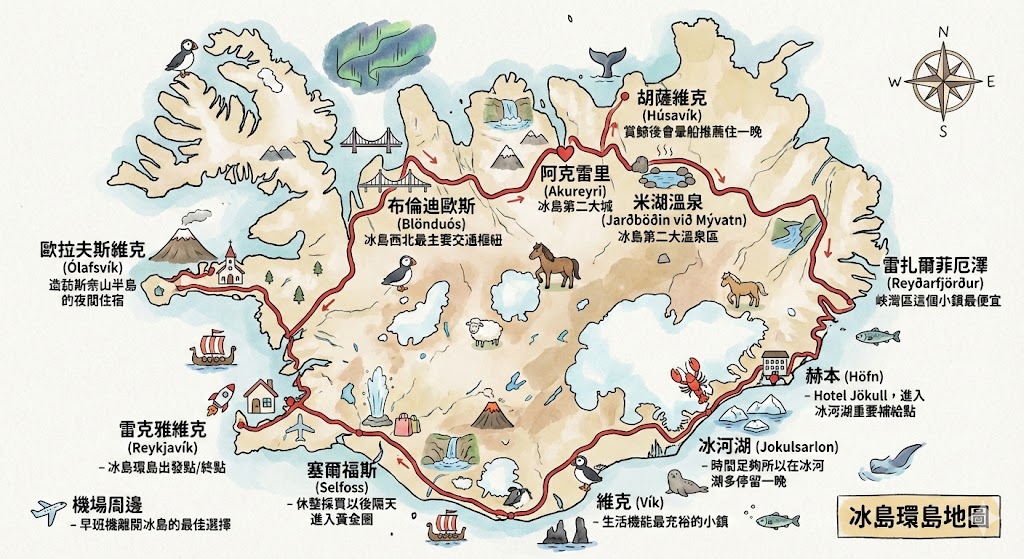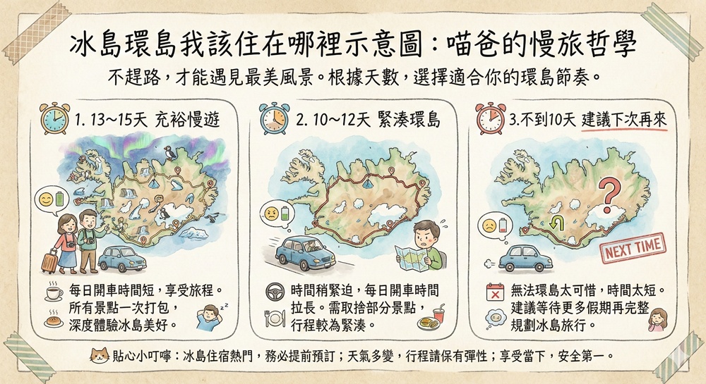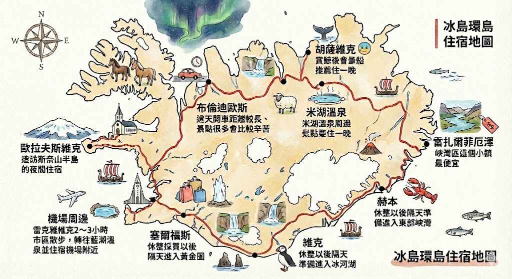 每天開車時間不要太久、所有冰島景點全部都要去,結合這兩個考量,喵爸推薦的冰島住宿地點如下