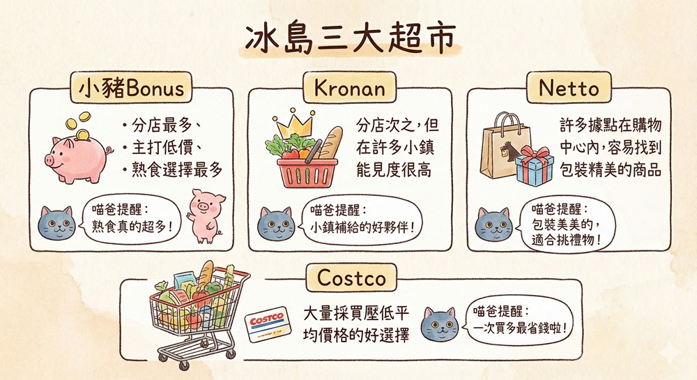 冰島超市共有小豬Bonus、Netto、Kronan三大系列,許多人也會選擇把好市多Costco列入清單之中。