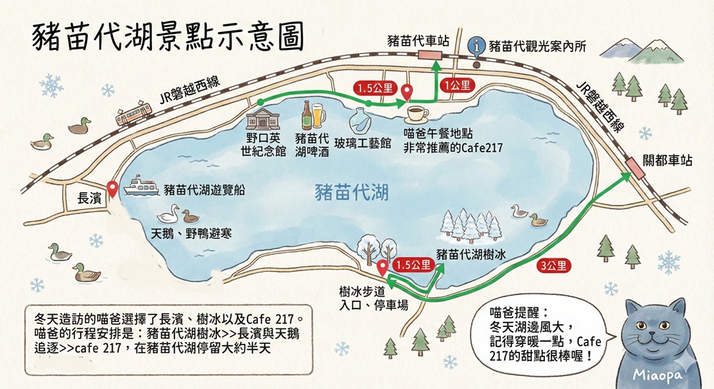 下圖為豬苗代湖周邊主要著名景點與大略的距離,冬天造訪的喵爸選擇了長濱、樹冰以及Cafe 217。喵爸的行程安排是:豬苗代湖樹冰>>長濱與天鵝追逐>>cafe 217,在豬苗代湖停留大約半天的時間。