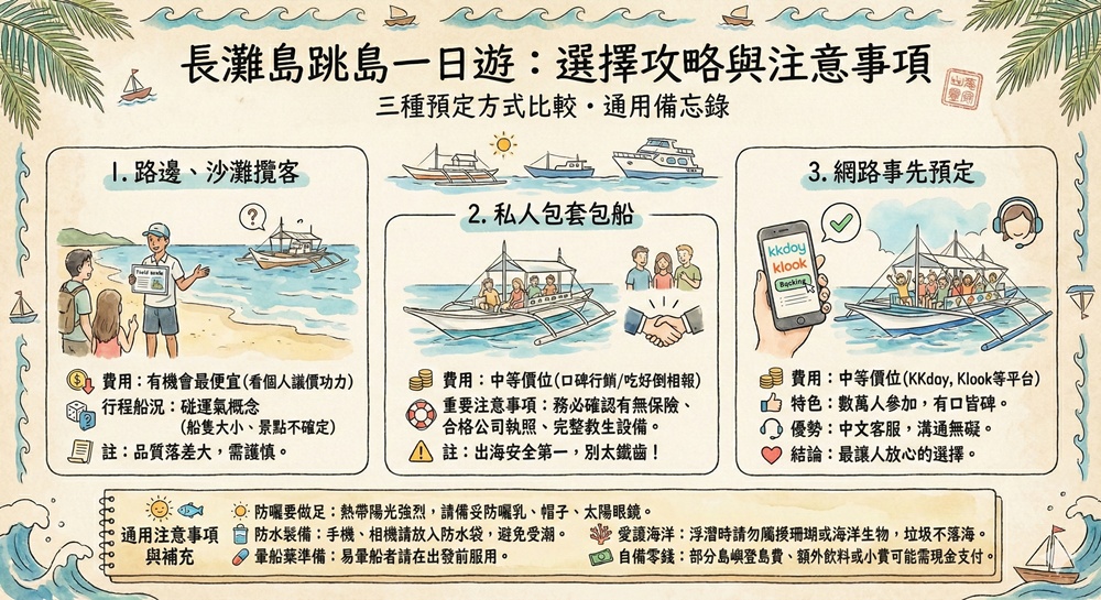 長灘島跳島出海行程其實都大同小異,浮潛地點大多是長灘島西部與南部魚群較密集的區域,兩次登島通常會選擇北部的貝殼沙灘與東部的鱷魚島周邊。沙灘路邊攬客、私人包套與台灣事先預定,這三種的差異就在於船隻大小、併團人數與行程費用上。