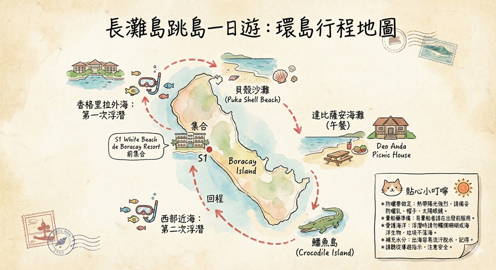行程:第一碼頭White Beach de Boracay Resort前集合>香格里拉度假村外海第一次浮潛>貝殼沙灘(Puka Shell Beach)>達比薩安海灘(Deo Anda Picnic House)午餐>鱷魚島(Crocodile Island)>長灘島西部近海第二次浮潛