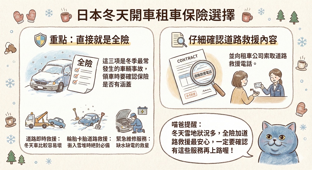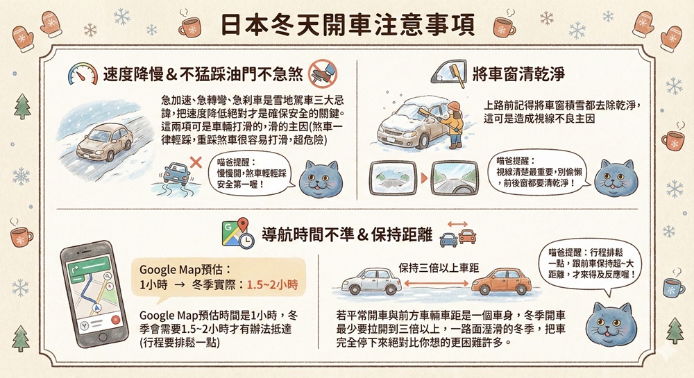 但是冬天租車自駕難度與可能遇到的突發狀況絕對比你想像中多的太多太多,如果你是日本自駕新手或不曾在海外開車,喵爸強烈建議先多累積幾次夏天自駕的經驗再來考慮挑戰冬天自駕,而且全程將車速放慢、萬事小心再小心、避免晚間開車才是日本冬天開車安全的不二法門!