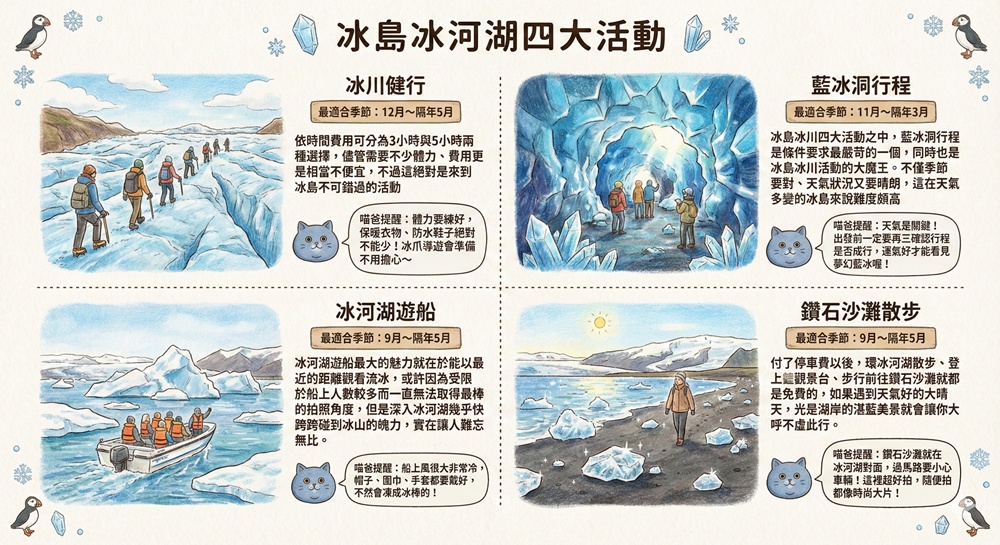 冰川健行、藍冰洞行程、冰河湖遊船、鑽石沙灘散步,這四件事來到冰島冰川區最推薦的活動,同時也是冰島自然景觀之中,不可錯過的超級重頭戲。