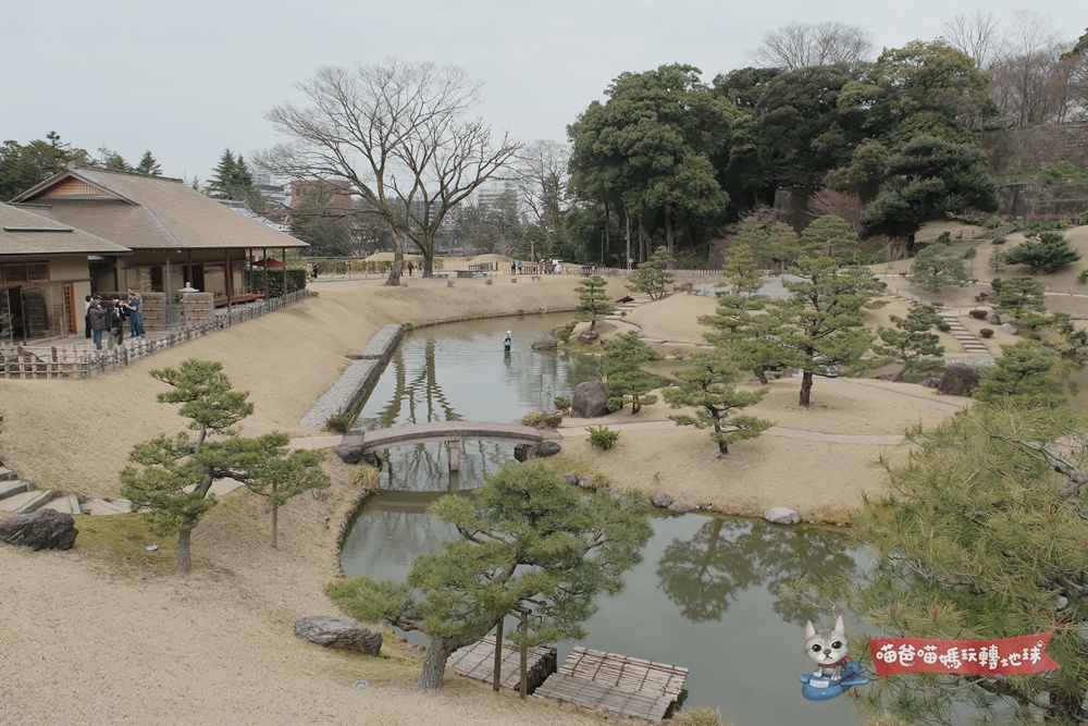 離開了五十間長屋,我們轉往位於城郭一角的「玉泉院丸庭園」。與兼六園的迴遊式庭園不同,這裡屬於「池泉回遊式庭園」,更強調造景的立體感與石組的配置。
