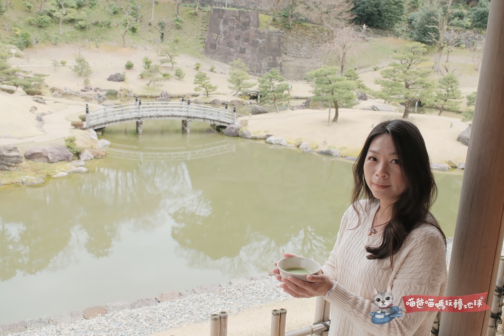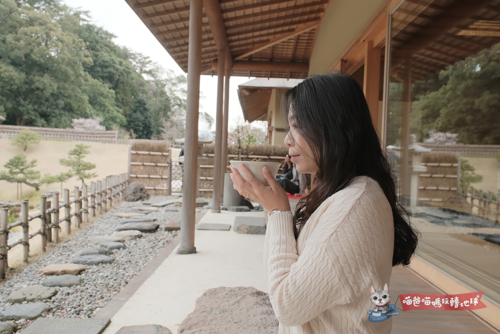坐在庭園旁的玉泉庵,點一份抹茶與和菓子,看著眼前這幅如同山水畫般的景色,實在享受。