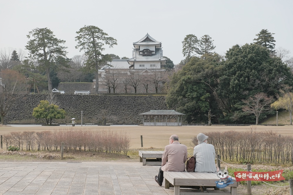 屋頂上那帶有白色鉛瓦在陽光下閃耀著光芒,這不僅是為了美觀,傳說更是為了在戰爭時能將鉛融化以此製作彈丸的戰備考量;而廣大的草坪與公園化的設計,也讓這裡成為金澤市民最棒的休閒場所。