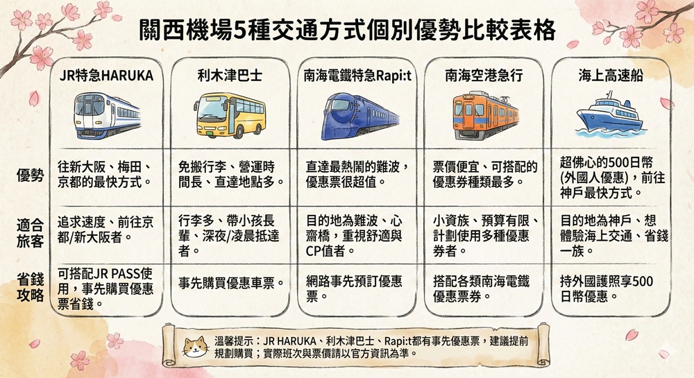 關西機場5種聯外交通:JR特急HARUKA、利木津巴士、南海電鐵特急Rapi:t、空港急行與海上高速船