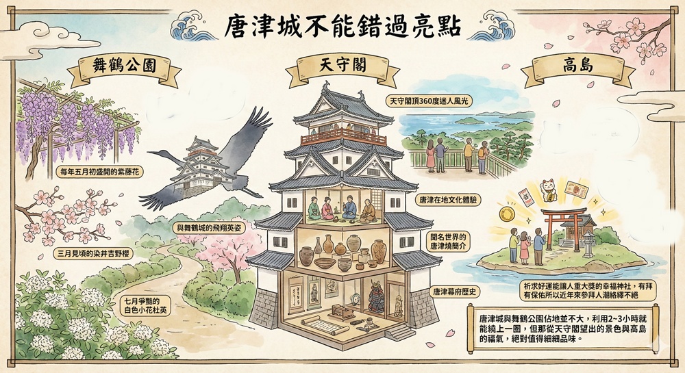 唐津城歷經六代蕃主交替、日本鎖國後全面開放與1960年近代大規模重新修復,如今的唐津城被區分為舞鶴公園與唐津城天守閣兩大部分。除了不變的高島與彩虹松原美麗海灣弧線,更將唐津地區最具代表性的唐津燒與數百年豐富幕府歷史導入天守閣展示,舞鶴公園內更是廣植500餘株染井吉野櫻與數株樹齡超過百年的老紫藤樹,陸續添加的元素都更豐富了唐津城的一切。