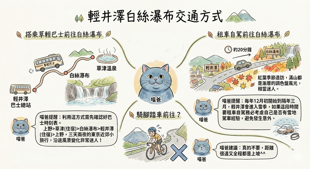 白絲瀑布距離輕井澤車站大約12公里,前往交通方式不外乎就是草輕巴士與租車自駕(如果你想詢問是否能騎腳踏車前往?喵爸會建議你:真的不要,距離很遠又全程都是上坡^^)