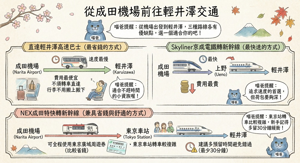 從成田機場出發前往輕井澤有許多種不同的方式,喵爸列出三種最多人會選擇的交通方式