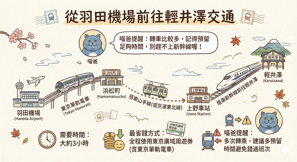 搭乘方式:羽田機場搭東京單軌電車到浜松町,再搭乘山手線(或京濱東北線)前往上野車站,從上野車站搭新幹線前往輕井澤。