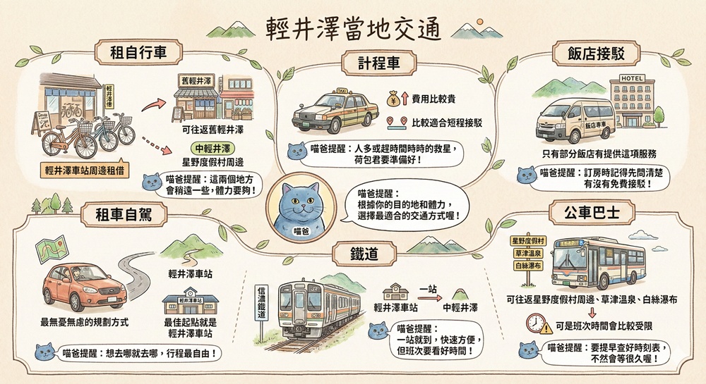 呼~終於來到輕井澤,除了租借自行車慢遊,如果我想去更遠的地方,有甚麼交通選擇?大概就是喵爸列出下面這幾種^^