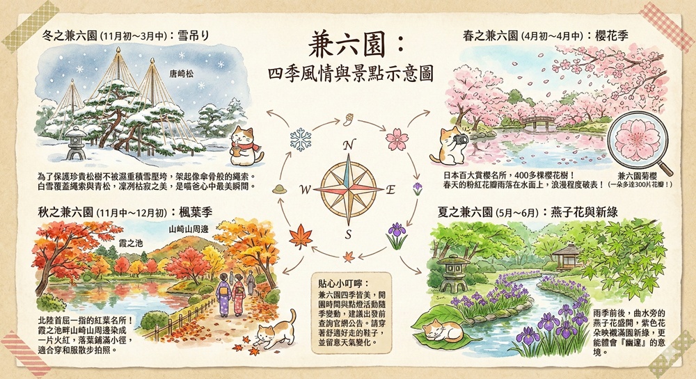 冬天的兼六園(11月初~3月中):北陸地區的雪質濕重,為了保護園內珍貴的唐崎松不被積雪壓垮,會架起像傘骨般的繩索支撐樹枝,這就是著名的雪吊(雪吊り)。當白雪覆蓋在繩索與青松上,展現的凜冽枯寂之美,是喵爸心中兼六園最美瞬間。