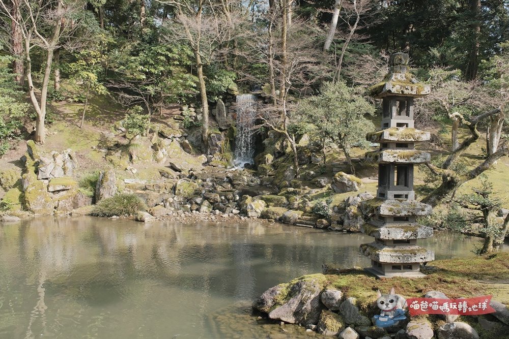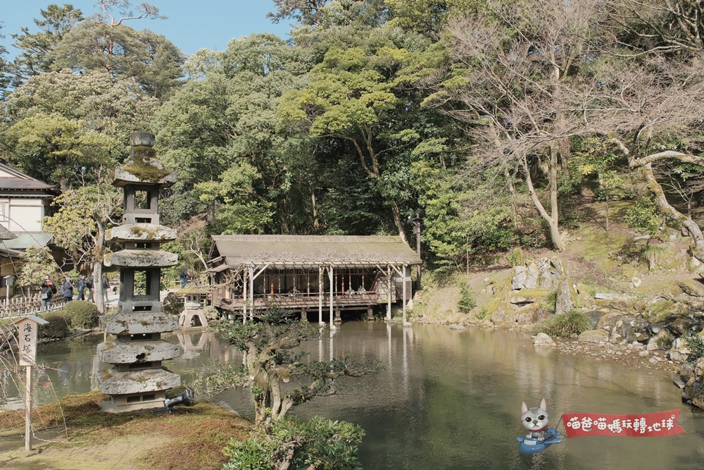 比起開闊的霞之池,位於園區另一側的瓢池就顯得更加隱密古樸。這裡是兼六園營建的發源地,旁邊還有一個高6.6公尺的翠瀧瀑布。這裡的氛圍非常寧靜,喵爸特別喜歡坐在池邊的夕顏亭稍微休息,聽著瀑布的水聲,感覺心靈都被淨化了。