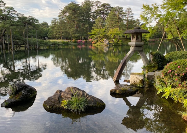 這絕對是兼六園的代表意象!位於霞之池北岸,這座石燈籠的特色在於它兩隻腳長短不一,一隻腳在陸地,另一隻腳在水中。因為形狀很像支撐琴弦的琴柱(徽軫)而得名。