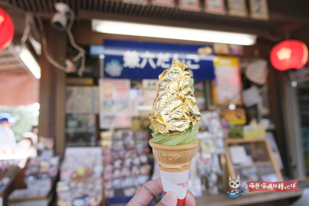 想進入時雨亭好好放空發呆一番或許要等候很久,但來一隻兼六園必吃的金箔冰淇淋卻是隨手可得,園區內許多小賣店就能很輕易買到,味道或許普普通通,但解成就的概念絕對是滿滿。
