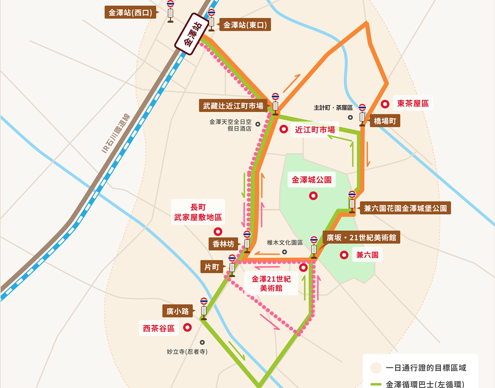 A. 城下町金澤周遊巴士(LL/RL):於「兼六園下・金澤城」站下車,車程約15-20分鐘。