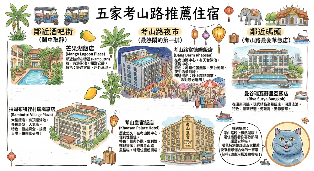 如果你怕吵又想喝兩杯,選酒吧街周邊;如果你是重度派對動物,直接住進考山路夜市裡;如果你想在背包客區享受奢華,那就選碼頭邊的豪華飯店^^