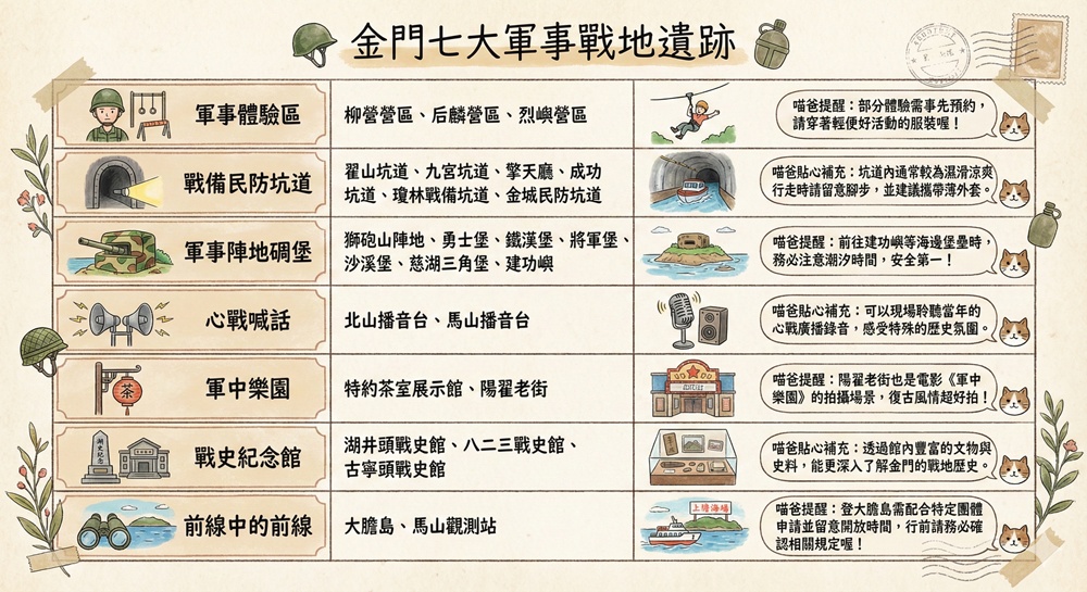 散佈於大小金門島上20多個軍事基地遺跡,喵爸將其分為七大類分別是:軍事體驗區、戰備坑道、軍事碉堡、心戰播音牆、戰史紀念館、軍中樂園與前線中的前線,每一種都是先人以生命為民主自由拼鬥多年留下來的遺跡,背後深藏的歷史故事來到金門絕對值得你仔細探訪一番。