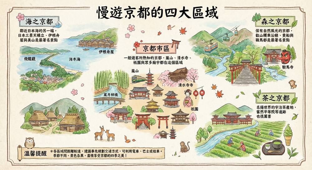 京都市區:一般遊客所熟知的京都,嵐山、清水寺、祇園與眾多神社都在這個區域
