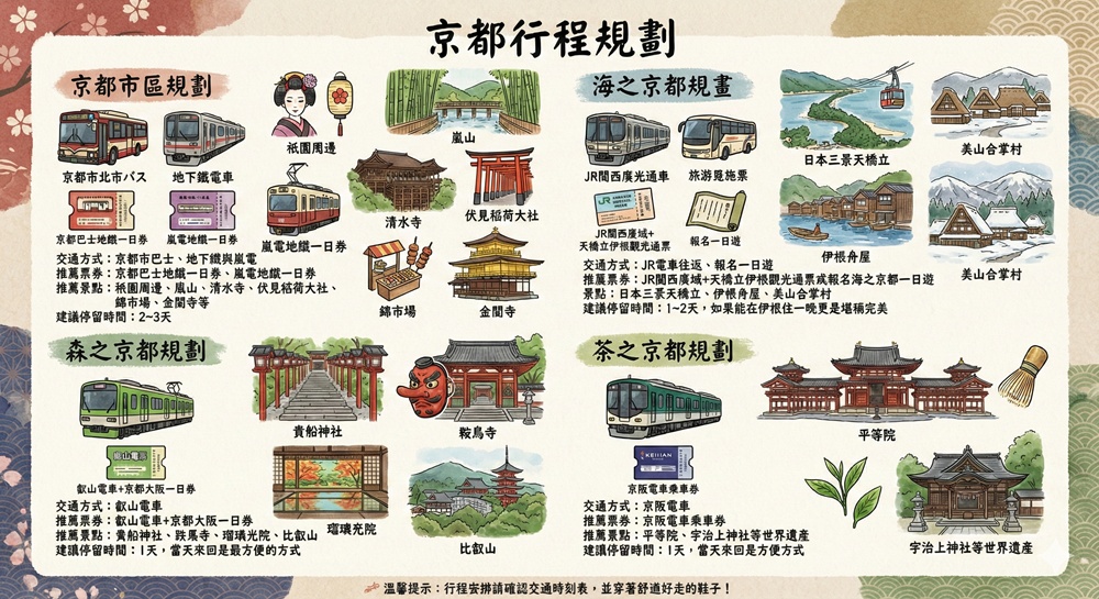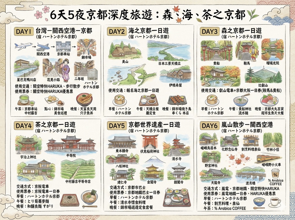 京都六日遊的時間分配:京都市區三天、海之京都一天、森之京都一天、茶之京都一天,準備的票券有