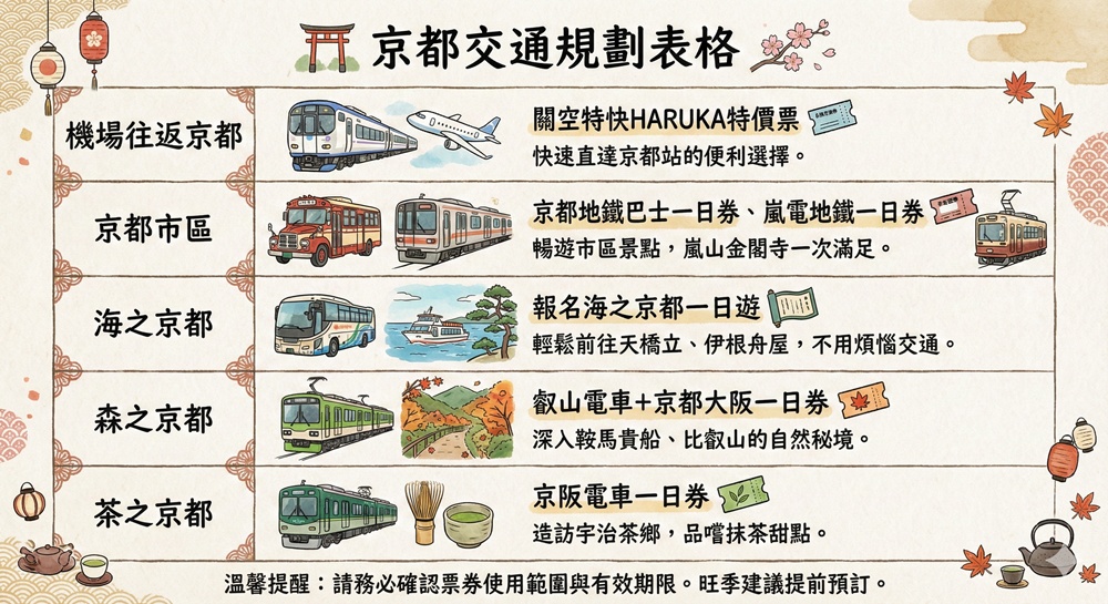 票券:JR PASS/關西鐵路卡/京阪電車、叡山電車/天橋立套票/地鐵+嵐電/樂享周遊券