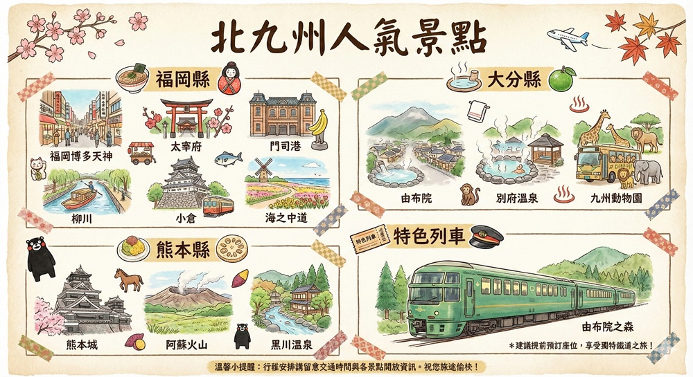 福岡、大分、熊本三縣人氣景點當然不只這些,但經典行程本來就是以最大、最人氣的景點為主,當你愛上九州的多元樣貌,或許下次能再規劃更長的天數停留探索九州更多元風貌!