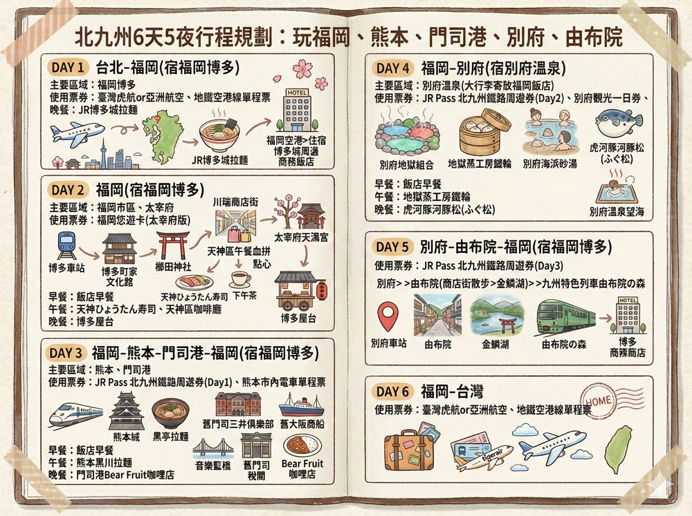 喵爸的行程跨足北九州福岡、別府、門司港、由布院、熊本各區域,為了節省交通時間就以北九州JR PASS搭配地區票券為主要規畫方式。