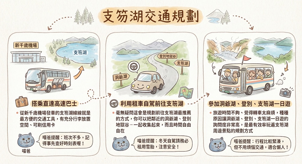 直達高速巴士、租車自駕、報名當地一日遊,這是三種規劃前往支笏湖最常見的交通方式,由於已開發的區域不大,大多遊客都會把支笏湖連同登別溫泉、洞爺湖一起規劃在行程之中。