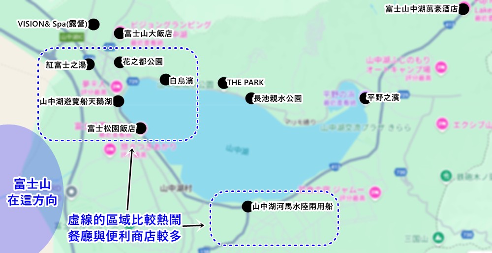 山中湖景點相對位置如下,或許並不如河口湖那麼熱鬧,但卻處處隱藏絕妙的風景