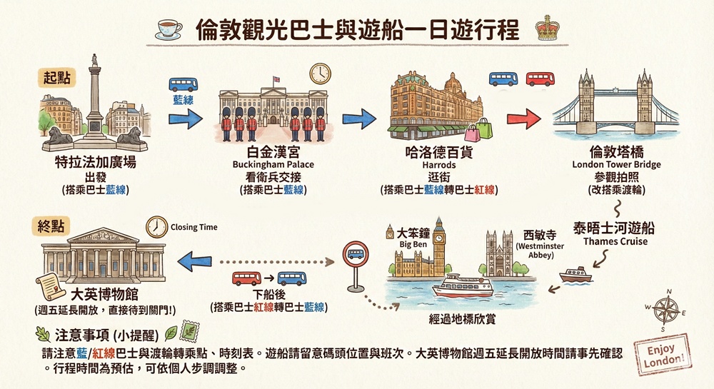 4.行程建議安排在週五:配合大英博物館周五的延長閉館時間(開到20:30),可將雙層巴士發揮到最大