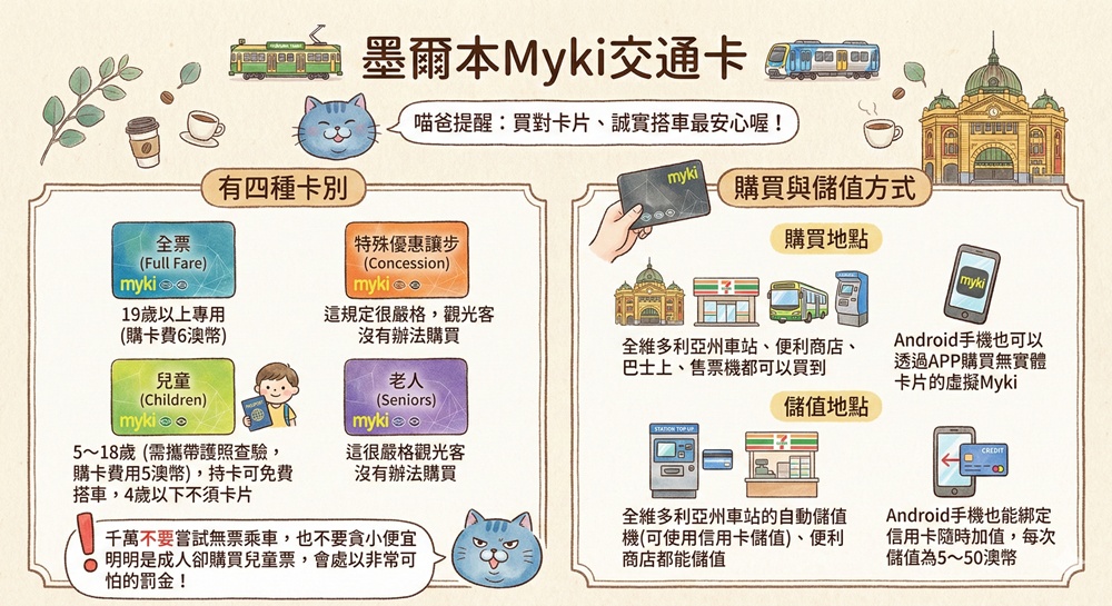 購買地點:全維多利亞州車站、便利商店、巴士上、售票機都可以買到Myki交通卡,Android手機也可以透過APP購買無實體卡片的虛擬Myki