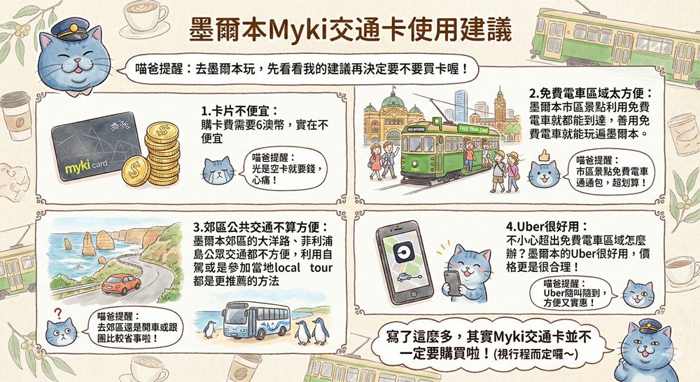 這篇讓喵爸分享墨爾本的Myki交通卡怎麼買、怎麼用、如何計費以及使用上有甚麼限制,也分享墨爾本最便利的免費電車與其他交通方式^^