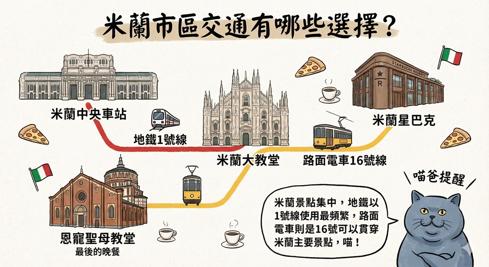 米蘭交通網絡看起來密密麻麻,但事實上由於景點太集中,觀光客會用到的交通工具不多,地鐵以1號線使用最頻繁,路面電車則是16號可以貫穿米蘭主要景點。