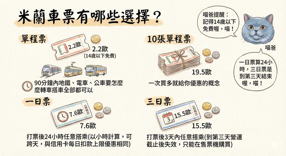 義大利人不喜歡太複雜的東西,所以把交通車票設計的相當簡單,你只要依照在米蘭停留時間挑選即可