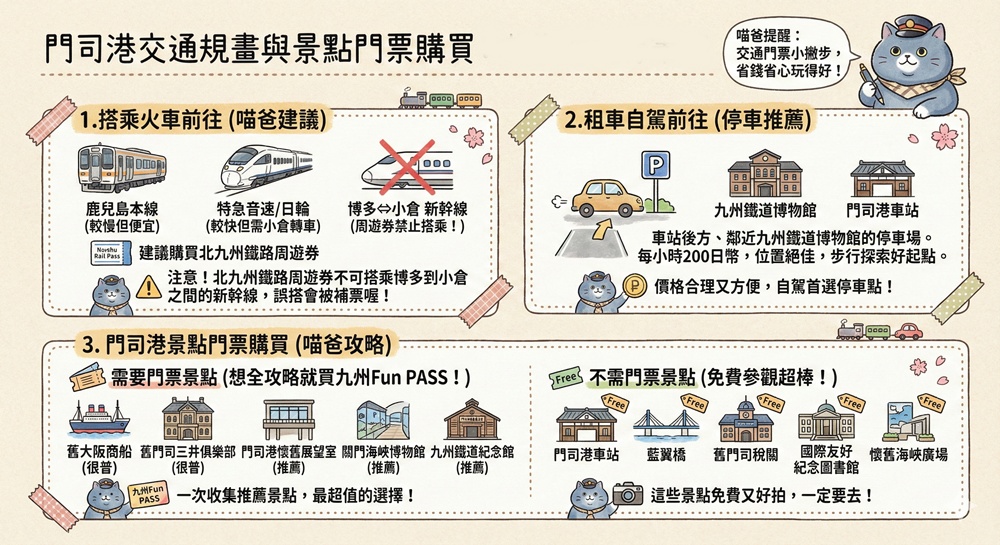 不論是租車自駕或搭乘JR往返門司港都相當友善,景點門票則是推薦九州Fun PASS可省下不少花費。