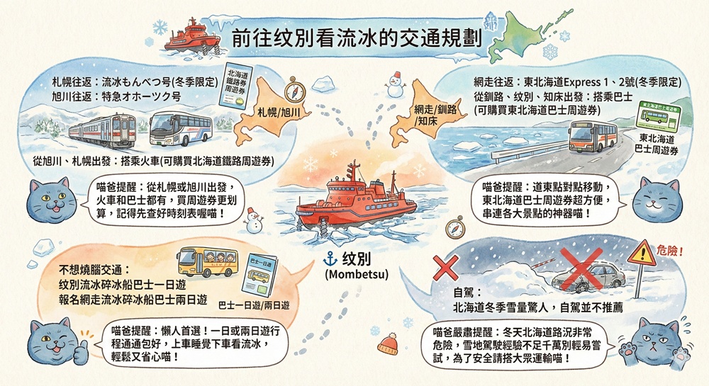 前往纹別搭乘流冰船的交通規劃