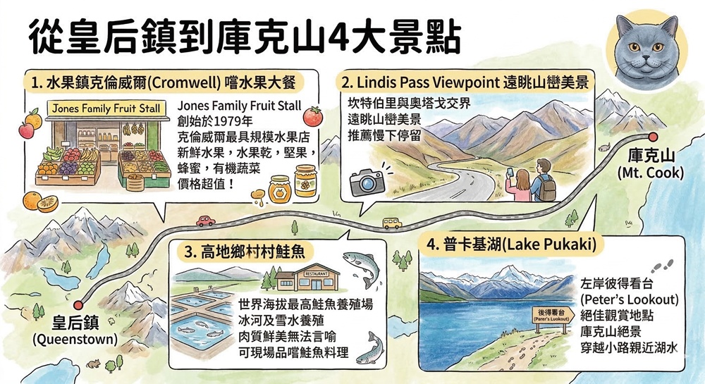 下圖為喵爸從皇后鎮到庫克山的路線圖與中途四個停靠點:水果鎮克倫威爾(Cromwell)、Lindis Pass Viewpoint、高地鄉村鮭魚(high country salmon)、普卡基湖(Lake Pukaki)觀景台