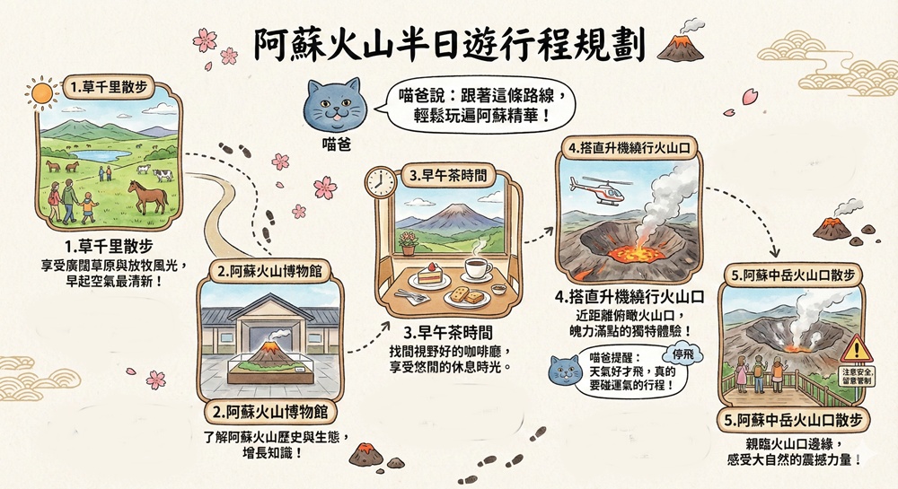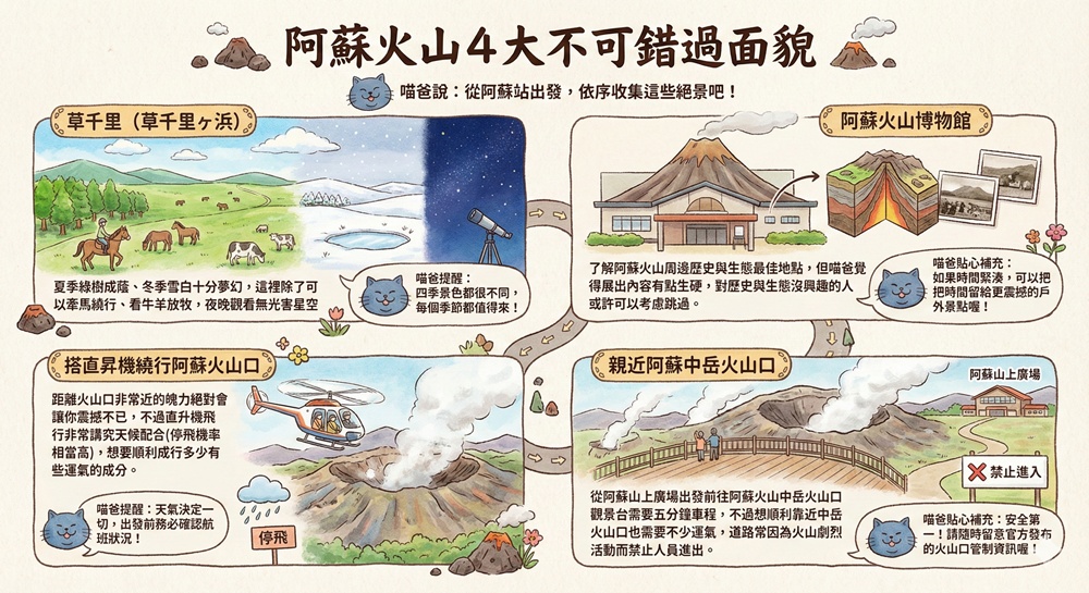 從阿蘇車站一路往阿蘇火山口前出發,依序會經過草千里、阿蘇火山博物館、火山口直升機搭乘處與中岳火山口步道,而這些依序通過的景點就代表者阿蘇火山的四大不可錯過面貌。