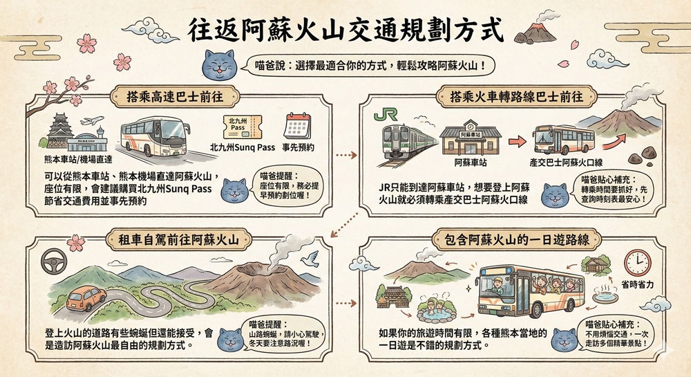 阿蘇山上線(熊本~阿蘇山上ターミナル線)可以從熊本車站、熊本機場直達阿蘇火山,這是不想轉車最方便的選擇,不過由於座位有限,選擇這方式會建議購買北九州Sunq Pass節省交通費用並事先預約