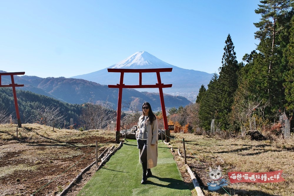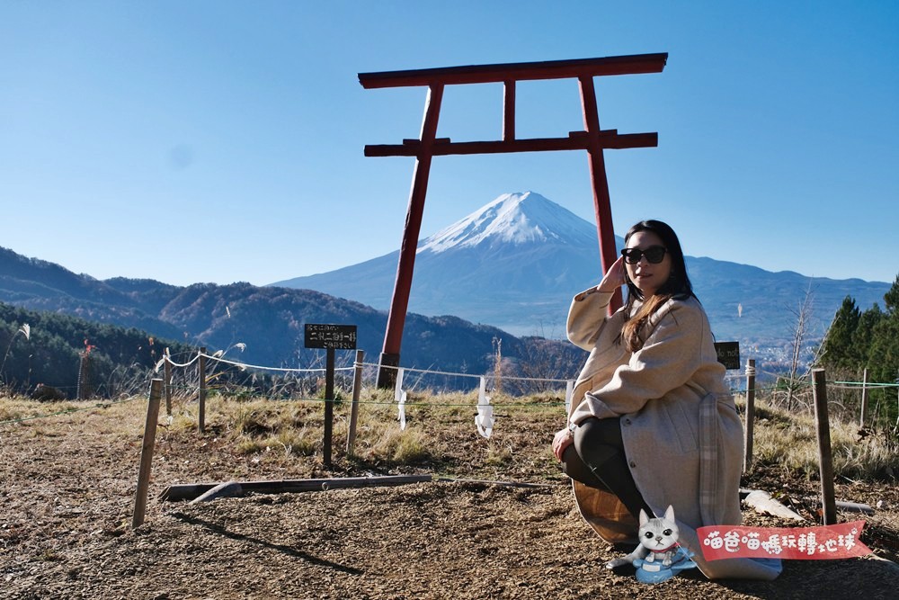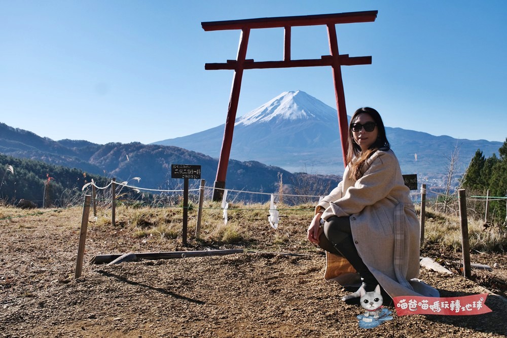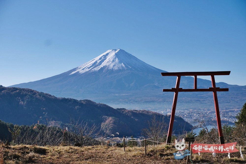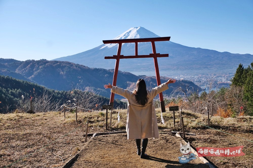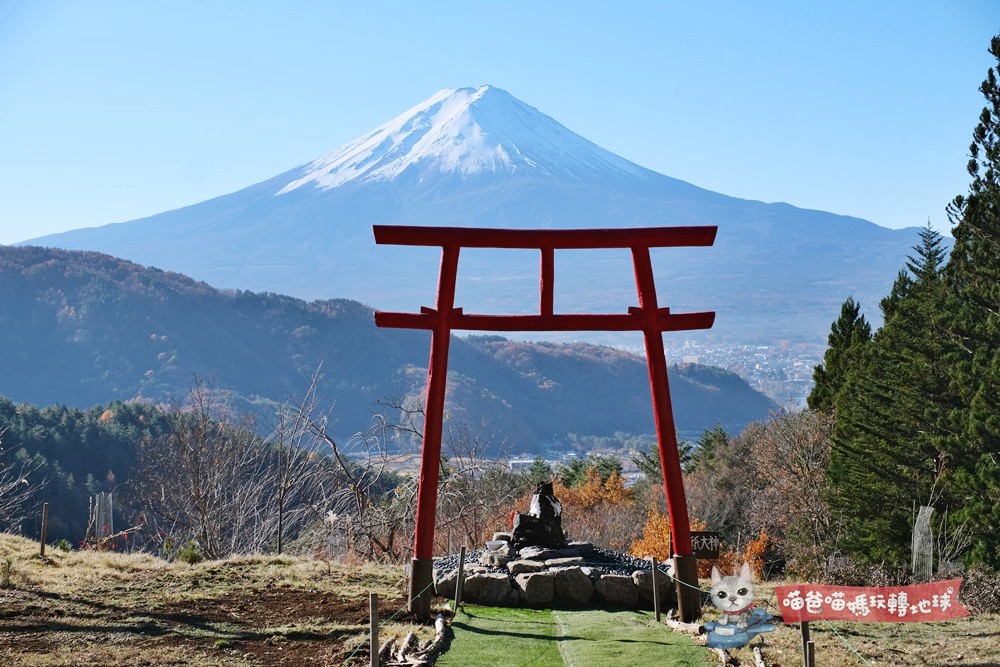 河口淺間神社遙拜所,這是近幾年河口湖最夯的觀景景點,能把鳥居、喵媽、富士山一次全部同框拍進照片裡面,瞬間就在社群媒體、IG上面爆紅,成為來到河口湖不可錯過的必遊景點。