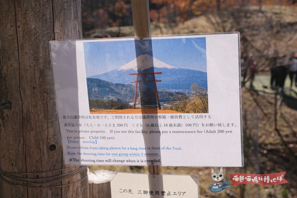 又高又夠近,再加上可以把河口湖小鎮與附近山巒通通一起拍進去,非常特殊的角度也難怪這個河口淺間神社遙拜所爆紅,從2024年開始為了應付越來越多人潮把鳥居增加為兩個(兩個拍出來的效果差不多),並且酌收200元的場地維護費用,這都讓人潮流通與排隊人數都有效的大大降低。