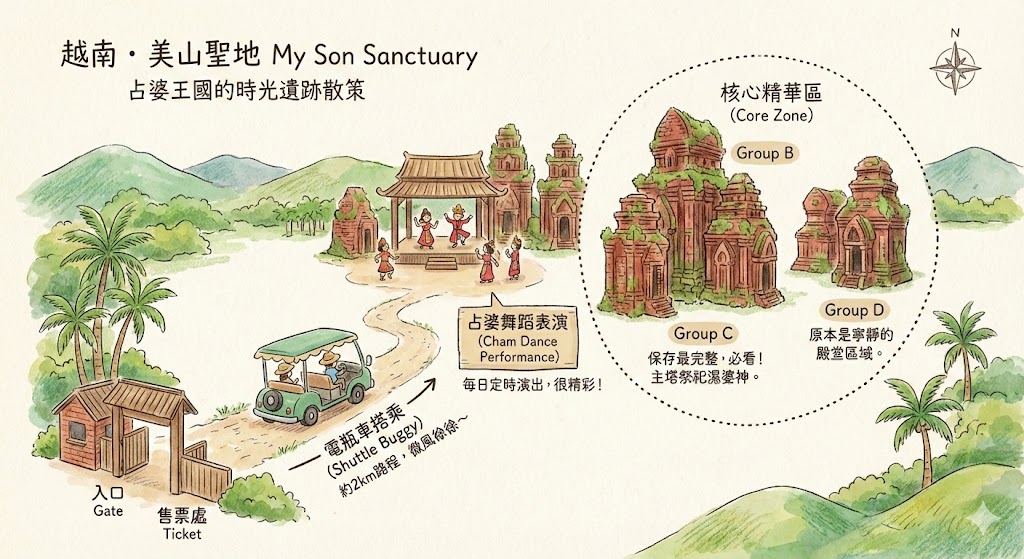 建議參觀路線(約3小時):入口售票處購票>搭乘電動接駁車(約10分鐘)>步行進入園區>占婆傳統歌舞表演(先確認時刻表)>Group B、C、D(核心精華區域參觀)>步行返回接駁車站>搭車離開