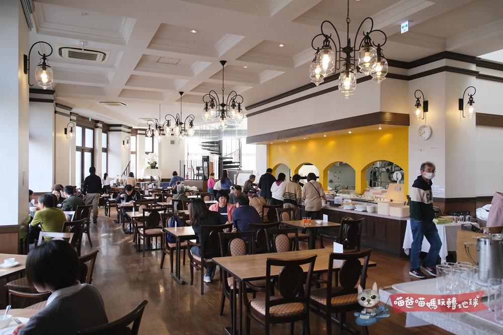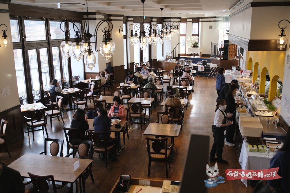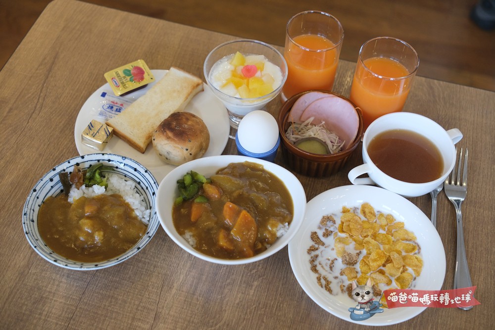 住宿一律免費供應早餐、早餐用餐地點就是面對車站有大片落地窗的遼闊空間,聽起來很厲害對吧,但供應的品項非常少、而且大多都是現成的半成品,老實說繞了一圈還真的不知道該拿甚麼才好。