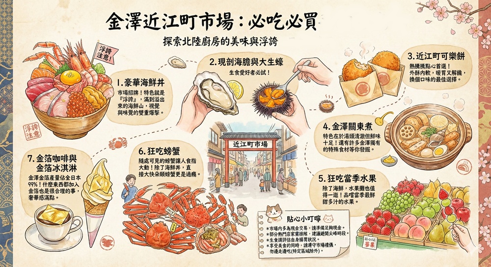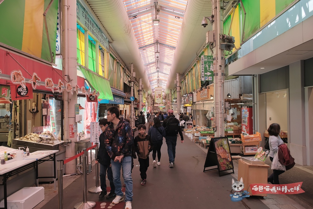 喵爸提醒:雖然近江町市場充滿了叫賣聲與人情味,但日本人還是習慣「定點飲食」。不論買了甚麼美食都建議在店家門口吃完再走,除了合乎當地的禮儀,也才不會有垃圾處理的問題!