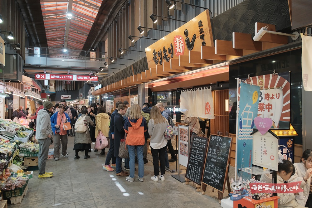 近江町市場的店家大約早上9點就會陸續開門,一直熱鬧到下午5點左右。喵爸強烈建議大家「早上來吃海鮮丼、下午來吃小吃」,盡量避開中午12點到1點的上班族用餐尖峰時間,才不用排隊排到懷疑人生。